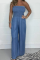 Off-Shoulder Tight Waist Slim Fit Stretch Washed Denim Jumpsuit