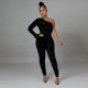 Fashion Sexy Slanted Shoulder Sequined PU Hip Jumpsuit
