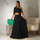 Fashion High Waist Pleated Colorblock Skirt Suit Two Piece