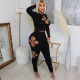 Fashion Hole Denim Jacket Flared Pants Two Piece Set