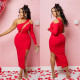 Solid Color Oblique Shoulder Mesh Stitching One-sleeve Slit Dress