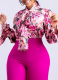 Contrast PU Leather Flame Print Zipper Cardigan Hip Skirt Suit