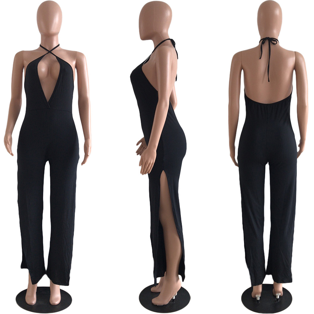 Copy| Product Name | Sexy Deep V Solid Color Split Backless Jumpsuit |